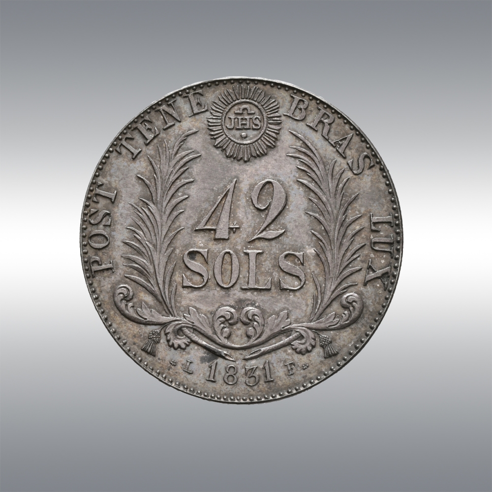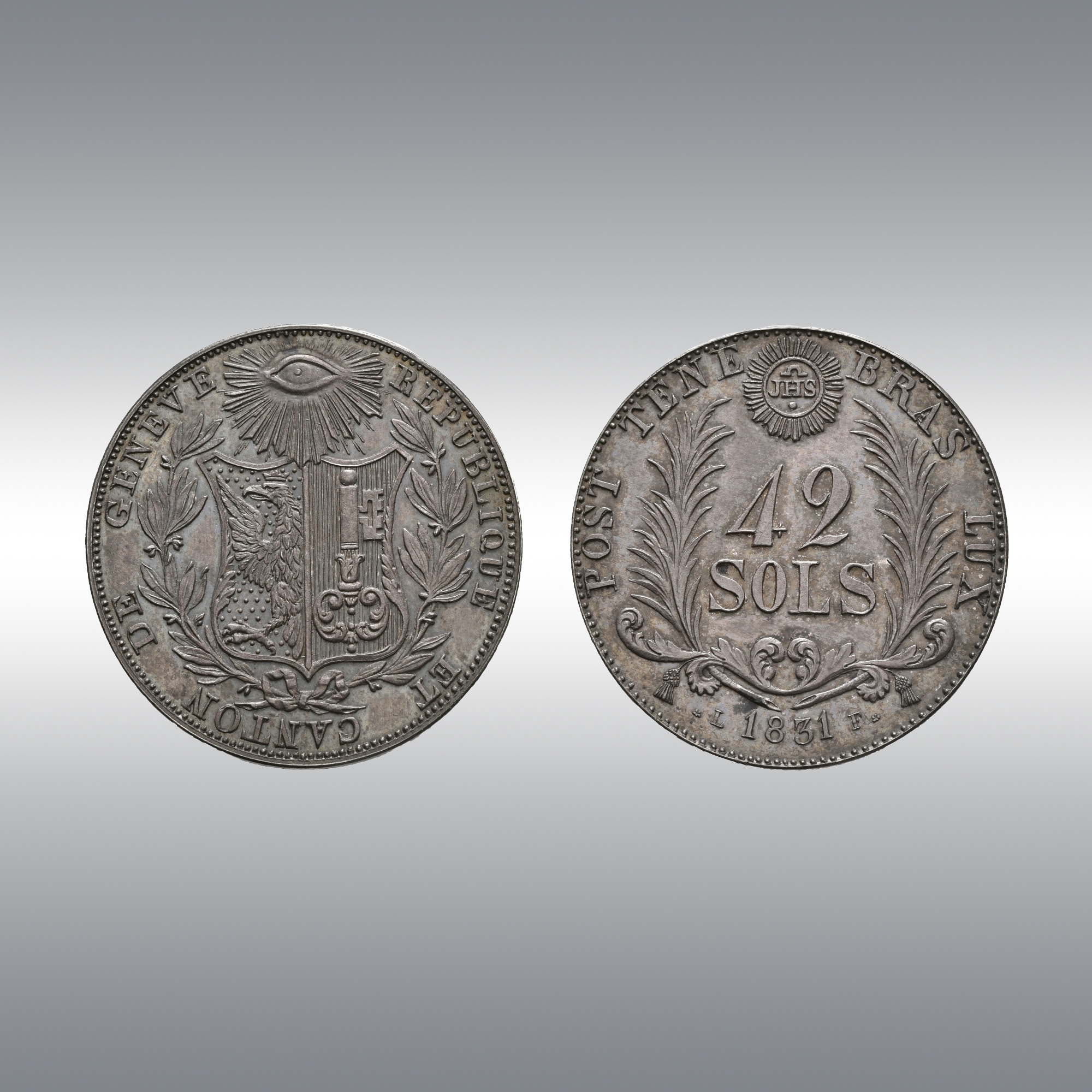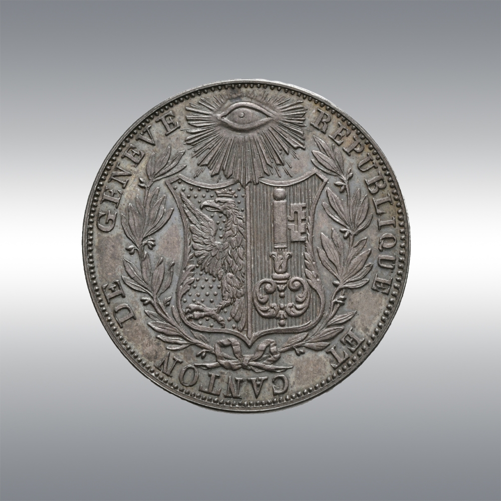 | Description | Shield of Geneva between two laurel branches. Radiant eye above / Value in two lines between two palm branches. IHS in a radiant sun above. Date in the exergue. |