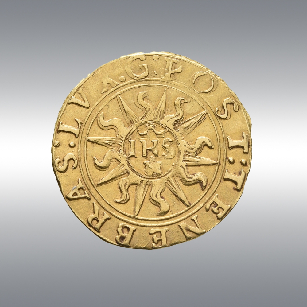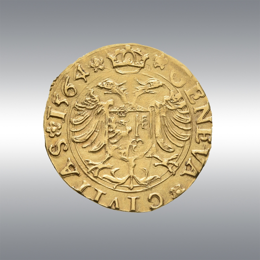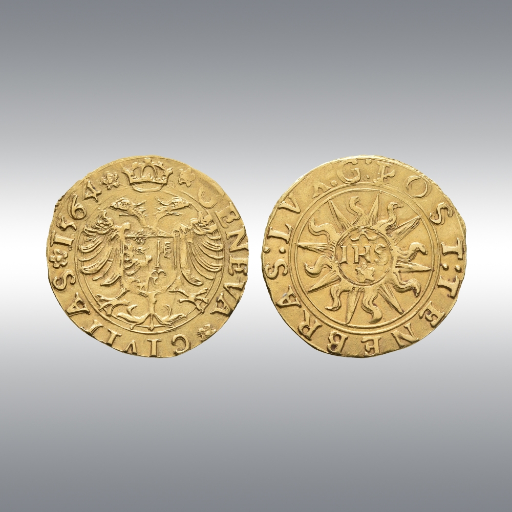 | Description | Imperial eagle crowned, bearing on its breast the arms of Geneva / IHS at the center of a sun composed of eight straight rays and eight wavy rays. |