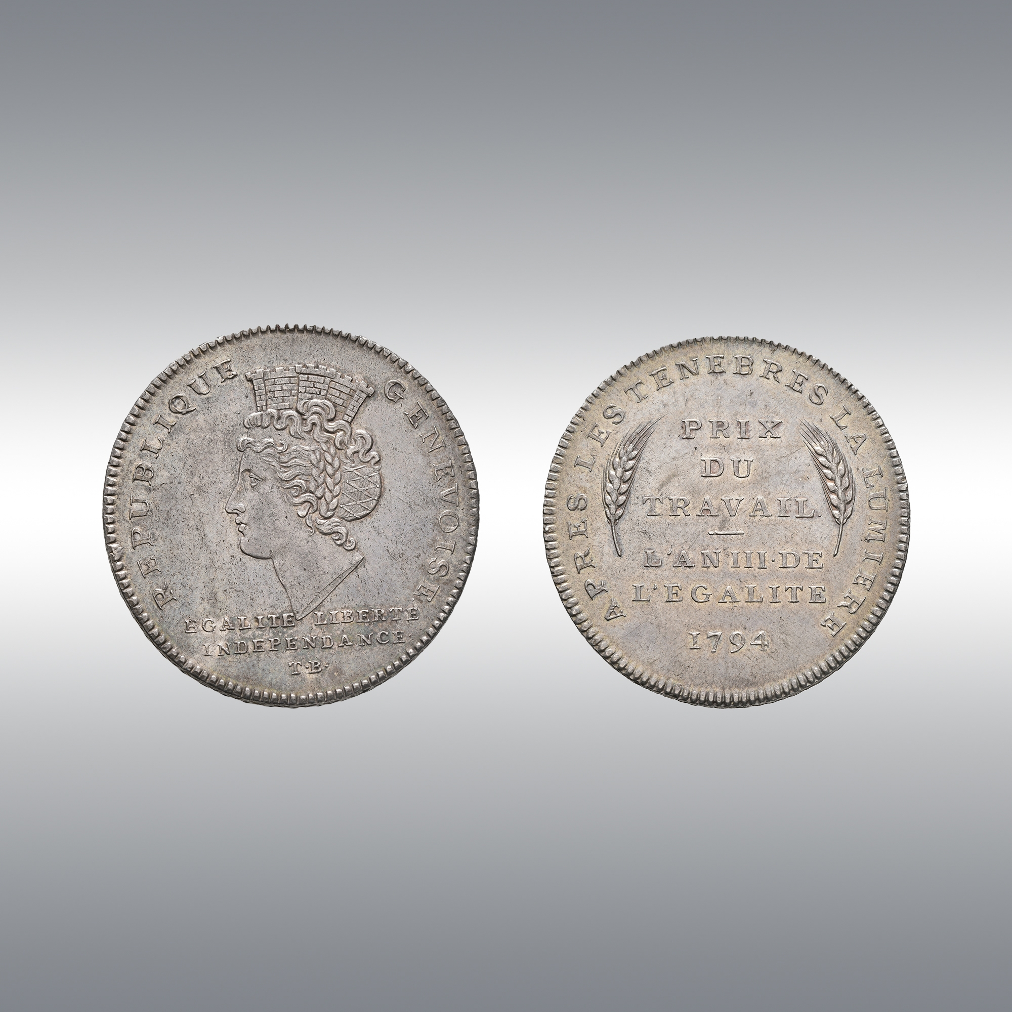 | Description | Tower‑crowned female head facing left. Inscription in three lines in the exergue / Inscription and date in six lines between two wheat ears. |