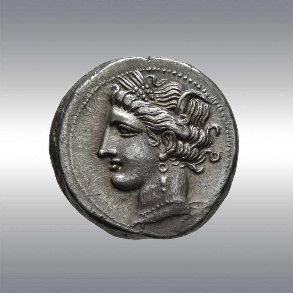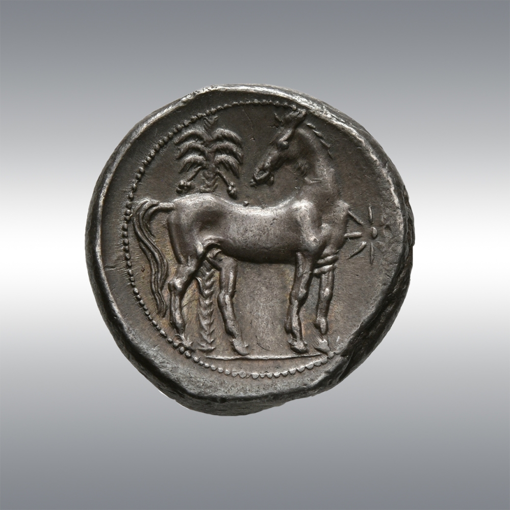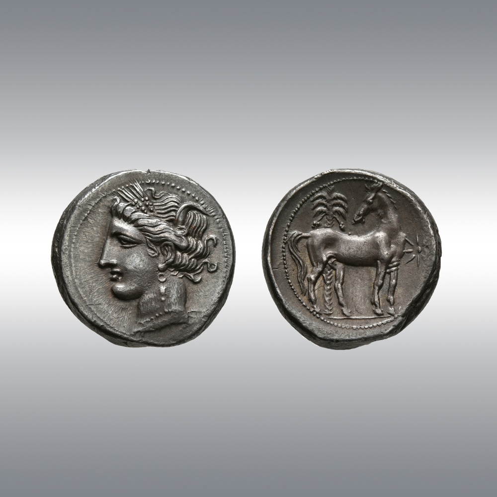 | Description | Head of Tanit-Persephone left, wearing pendant necklace, single-drop earring and grain wreath / Horse standing right, head reverted; behind, date palm. To right, star of eight rays. |