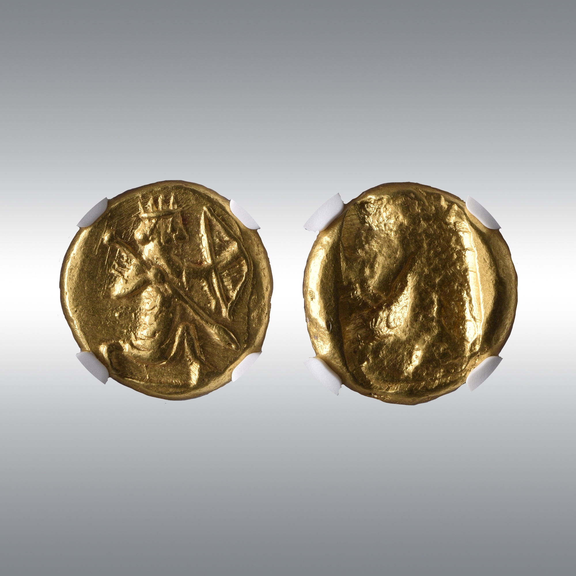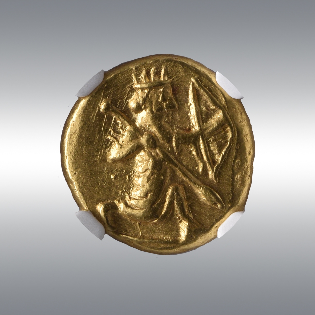 | Description | Persian king or hero, wearing cidaris and candys, quiver over shoulder, in kneeling-running stance right, transverse spear in right hand, bow forward in left / Rectangular incuse punch. |