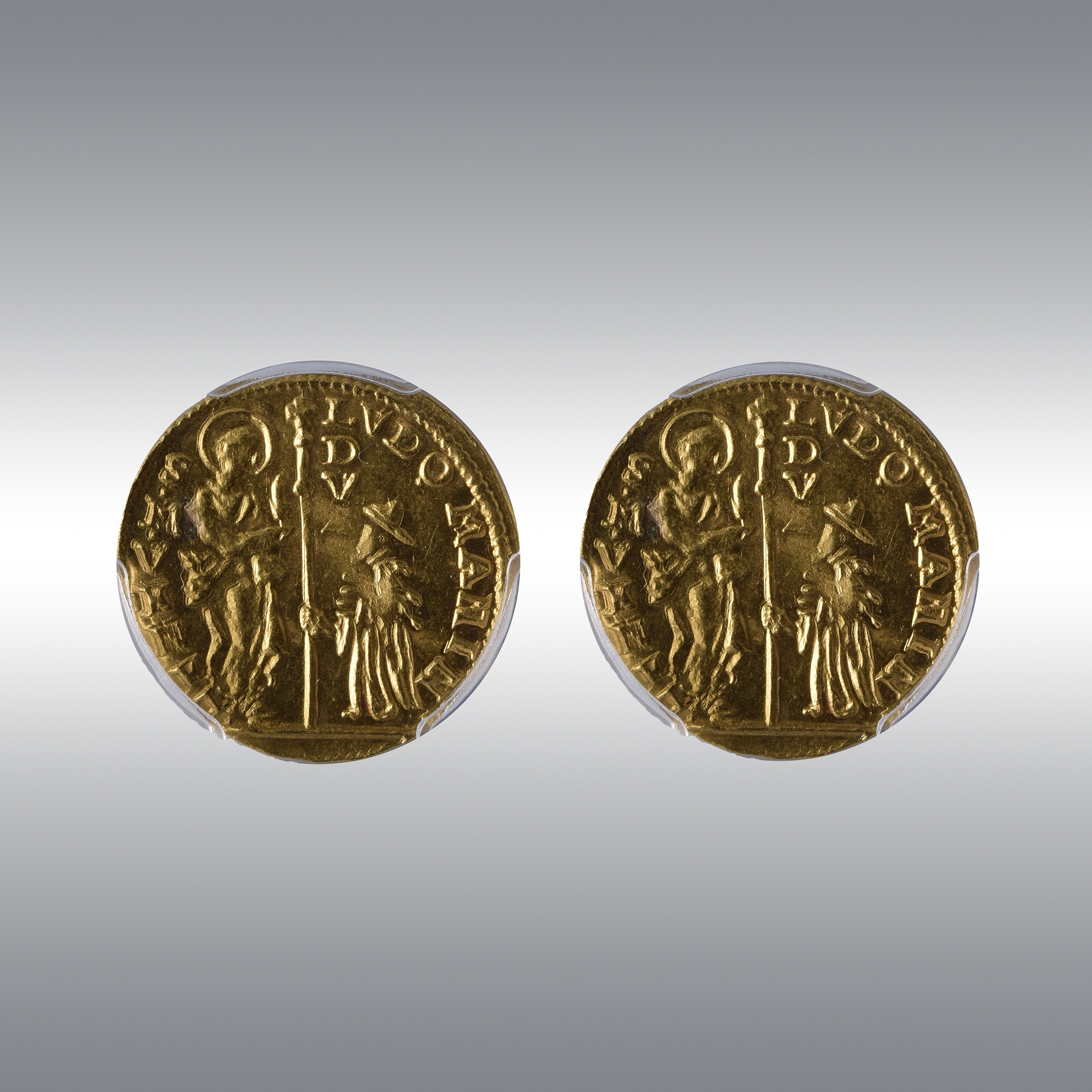 | Description | St Mark standing right, holding gospels and presenting banner, Doge kneeling left / Christ standing facing, raising hand and surrounded by stars. |